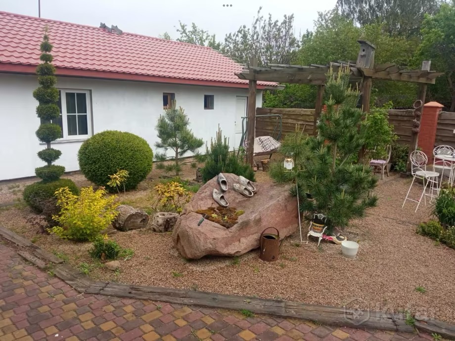 Украшение участка – своеобразная ландшафтная композиция с хвойными деревьями. Хозяин дома указал, что на территории есть еще и бассейн. Жаль, фото не предоставил.