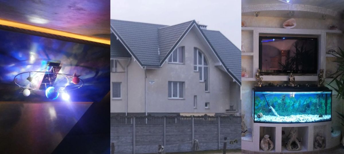 В доме есть цокольный этаж, а также мансарда. Общая площадь составляет 176,5 кв. м, а жилая — 88,0 кв. м. На первом этаже расположились большая прихожая, санузел, кухня-столовая и зона для отдыха. Помпезная мебель, колонны, розово-голубая подсветка вычурных натяжных потолков и аляповатые аксессуары. Еще больший резонанс вносят аквариум и шкура неизвестного животного на полу.