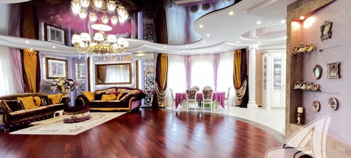 Арки, колонны с ордером, барельефы, мраморные полы и зеркала. С порога понятно, что здесь не про скромность. И роскошно убранная гостиная об этом просто кричит. Судя по фото, на полу начищенное до блеска покрытие цвета темного дерева. На потолке – витиеватая конструкция с натяжным потолком, в котором отражается вся комната. За счет этого создается иллюзия второго этажа и открытого пространства. Люстра, в стиле лучших будуаров Парижа, словно парит над всей комнатой.