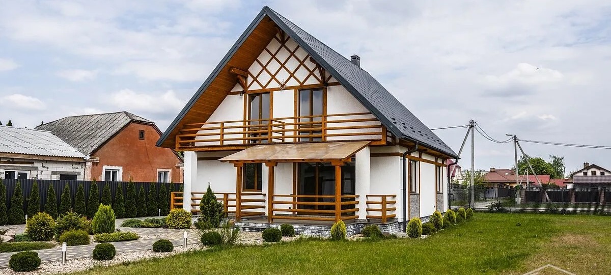 За счет двухскатной крыши и каркаса из дерева, состоящего из вертикальных, горизонтальных и диагональных балок, дом напоминает немецкие фахверки (решетчатая конструкция). Этот каркас гармонично перекликается с деревянными реечными ограждениями террасы.