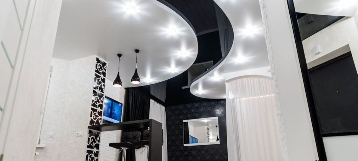Однокомнатная квартира находится на 15 этаже 18-этажной высотки на улице Гоголя. Многоквартирный дом был построен в 2018 году. Первое, что привлекает внимание — черно-белые цвета и замысловатые линии в интерьере. От взгляда на потолок может закружиться голова.