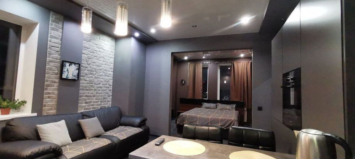 «Современная квартира с дизайнерскими решениями обставлена встроенной мебелью и укомплектована бытовой техникой. В связи с отсутствием межкомнатных перегородок, кухонная, гостиная и спальная зоны оформлены в общем монохромном стиле».