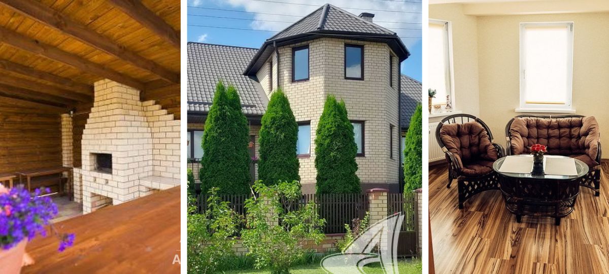 Стены выполнены из строительного бруса пущанского леса, фасад облицован силикатным кирпичом, а на кровле — металлочерепица. Общая площадь дома составляет 410,4 кв. м, а жилая — 121,7 кв. м.