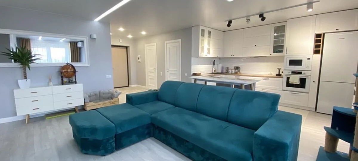 Трехкомная квартира находится в новом доме 2019 года постройки по улице Богданчука. В помещении выполнен качественный ремонт. Первое, что обращает на себя внимание, — необычная форма подсветки в гостиной и огромный мягкий диван лазурного цвета. На фоне белой кухни и стен он выполняет роль того самого яркого пятна. Стильного и гармонично сочетающегося с остальной обстановкой.