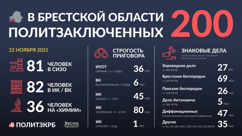 Брестская «Весна» 22 ноября 2021 года с помощью инфографики рассказала, за что и где сидят на тот момент 200 политзаключенных.