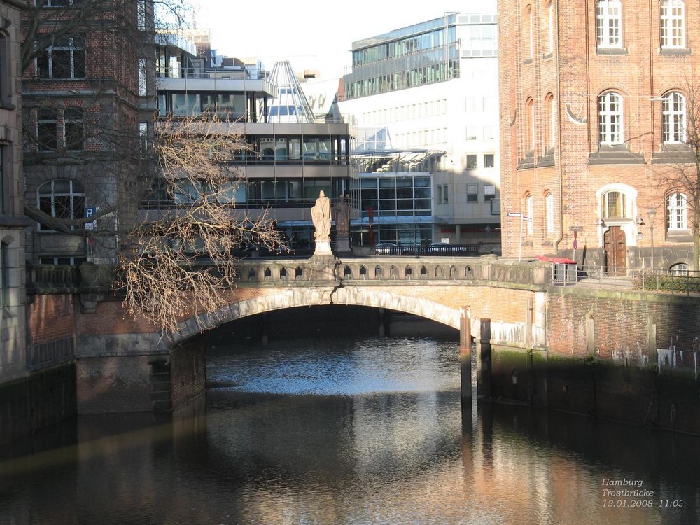 Каменный мост Тростбрюке построен в 1881 году на границе между старыми и новыми поселениями Гамбурга. Он пересекает одну из узких бухточек, соединяющих городские доки с Эльбой, а в переводе означает «Мост утешения». Такое название он получил из-за того, что по нему водили заключенных и осужденных на казнь, и красота моста была их последним утешением и отрадой.