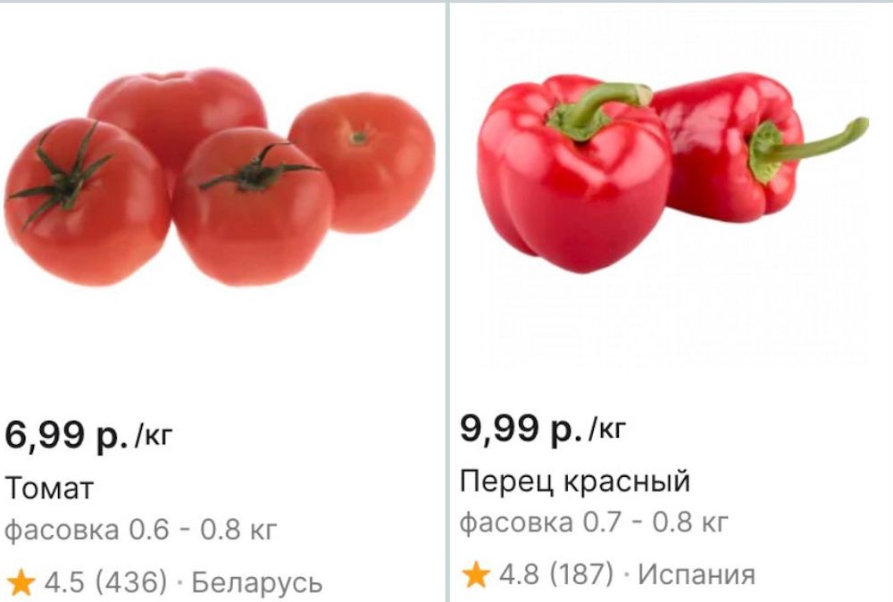 Едем дальше. Килограмм свежих огурцов на ярмарке можно было купить минимум за 1 рубль, максимум — за 5. А вот на сайте «Е-доставка» минимальная цена — 4,49, что в 4,5 раз дороже. Сколько же на ярмарке стоил сладкий перец? От 3 до 3,50 BYN за кило. Цена этого овоща в онлайн-магазине колеблется от 9,99 до 10,49 BYN. Больше, чем в три раза, чем на ярмарке.
