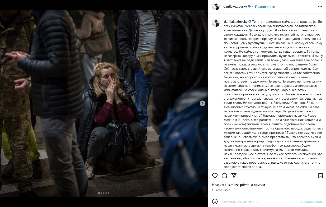 Глава Федерального проекта безопасности и борьбы написал донос о дискредитации армии и на российского актера Данилу Козловского. В своей жалобе в Прокуратуру РФ Бородин указал, что давно следит за актером в соцсетях и процитировал антивоенный пост Козловского, написанный в феврале 2022 года.