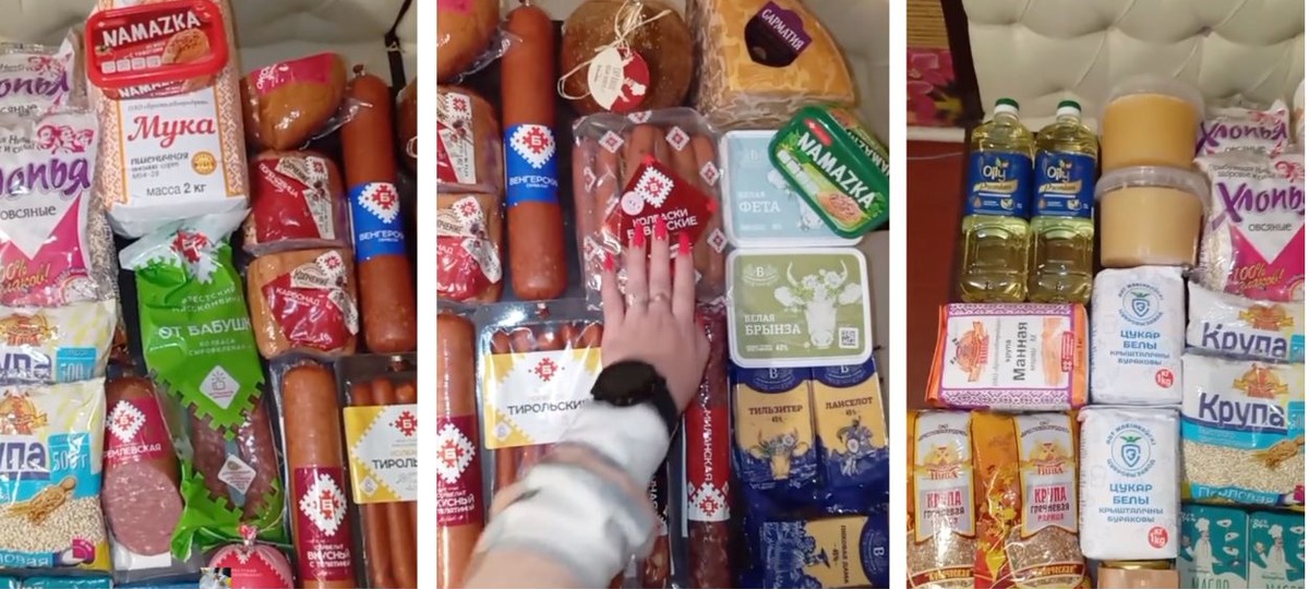 «Нам дали колбаски, сосиски, две курицы,плюс курица копченая, плюс бедрышки, колбаса копченая, какой то сервелат колбаса….еще варенка 2 палки…так потом на карту еще 200 р сегодня пришло».