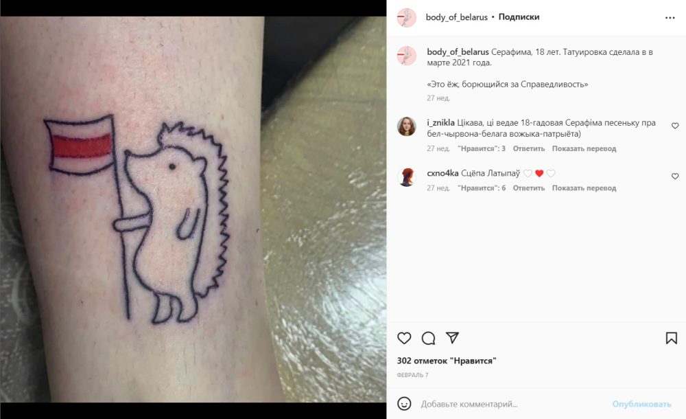 Евгения гордится тем, что авторкам проекта удалось онлайн пофотографировать героев, которые живут в Беларуси. В Варшаве люди открыто ходят с татуировками и не боятся их показывать. А в Минске беларусы прячут свои татуировки, потому что показывать их опасно. В провластных телеграмм-каналах периодически выходят «покаянные» видео с людьми, у которых набиты протестные татуировки. Они являются поводом для задержания.