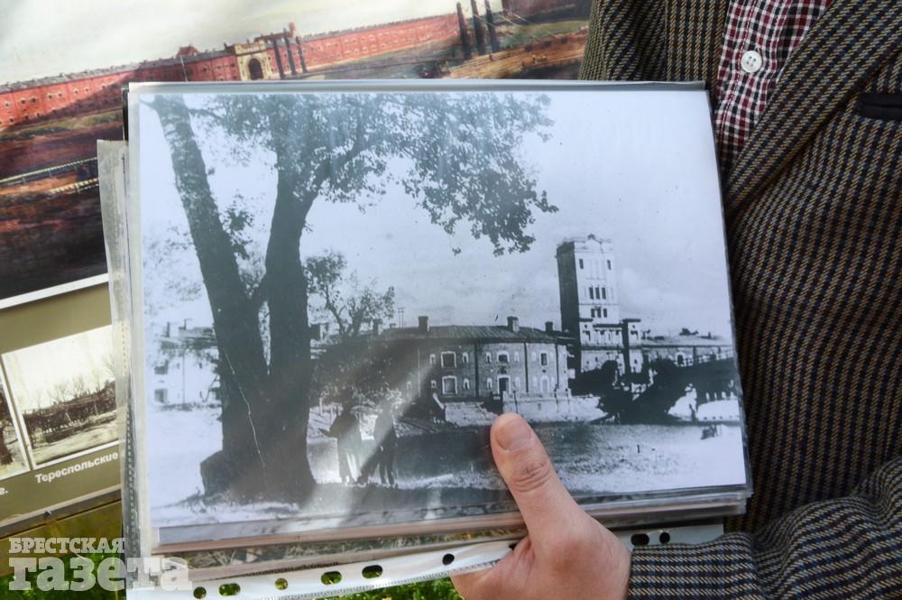 С такого ракурса Тереспольские ворота видели не многие брестчане. Когда-то здесь на берегу Буга (со стороны крепости) находилась лодочная пристань. До нашего времени она не сохранилась. Над воротами возвышалась водонапорная башня, основание которой сейчас видно под жестью крыши. Остров с крепостью соединял деревянный мост. О его существовании сейчас напоминают сваи, которые до сих пор торчат из воды.